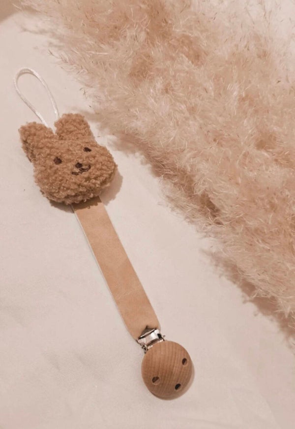 Dit heerlijk zacht konijntje is geschikt voor de allerkleinste! Een mooi, taupe kleurig speenkoord met een zacht konijntje.
