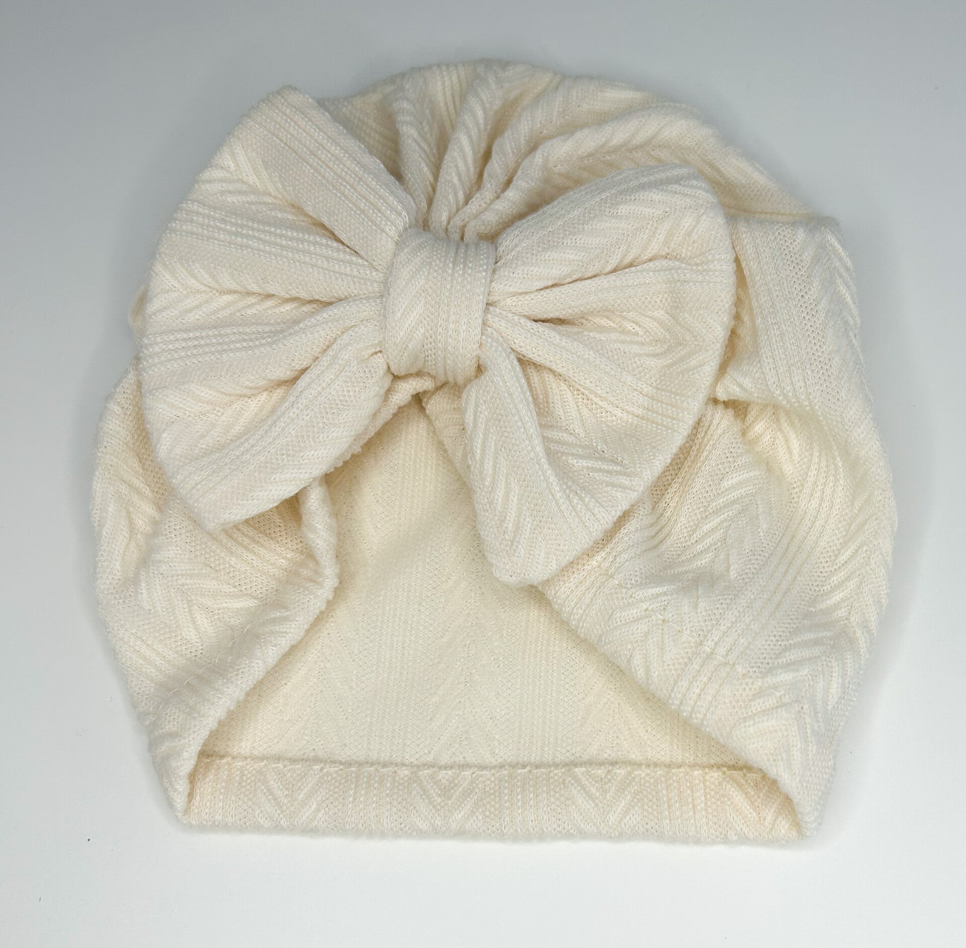 Heerlijk zacht mutsje in een gebroken wit/crème kleur met een decoratieve strik voorop.