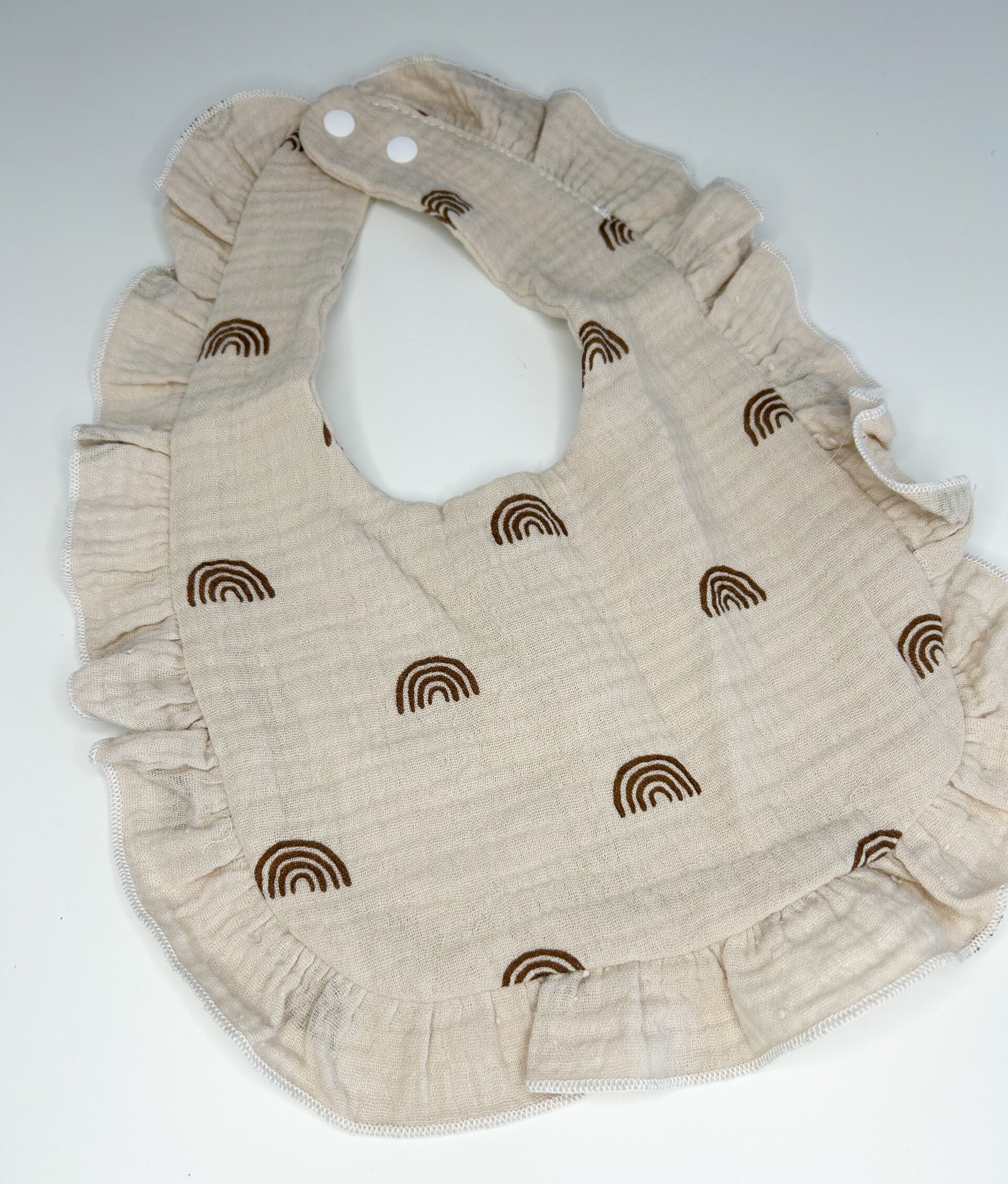Slabbertje van 100% katoen met een terracotta regenboogjes print op crème. Het modelletje is korter en zeer geschikt voor de eerste hapjes tot circa anderhalf jaar!