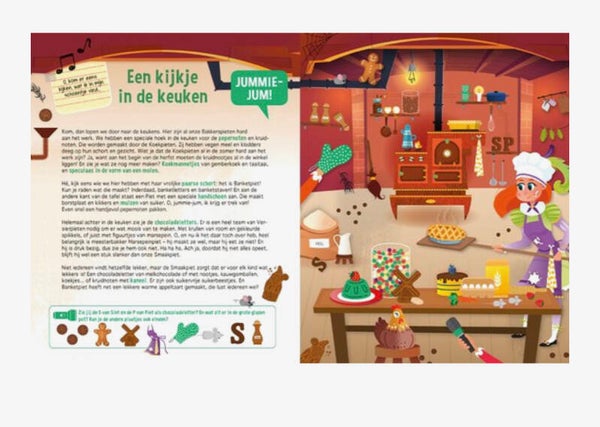 Speelgoed maken, pakjes inpakken, pepernoten bakken, de stoomboot gereed.. en dan komen Sinterklaas en zijn Pieten naar Nederland. Maar hoe en waar, wordt al dat lekkers en al dat speelgoed toch gemaakt? Nieuwspiet geeft je een kijkje achter de schermen! Het boek begint eerst met een educatief stuk over het onderwerp. Hier kom je ook gelijk de kartonnen zaklamp tegen. Vervolgens begint er een verhaal met dikgedrukte woorden. Deze dikgedrukte woorden staan onderaan de pagina afgebeeld. De rechterpagina is nu nog donker, maar als je de zaklamp hier achter plaatst ontstaat er een lichtbundel, net echt! Met de zaklamp kan er samen gezocht worden naar de afgebeelde dikgedrukte woorden. Zo lees je samen interactief een boek. Er zijn meerdere thema's te verkrijgen in deze serie!