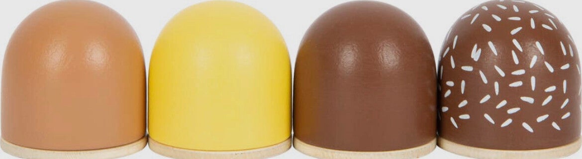 Voor de patisserie in de kinderkamer! Deze vier suikerzoete chocoladezoenen van hout zijn een hit voor rollenspellen in winkels en kinderkeukens. De vier zoenen bestaan uit: een witte chocolade, pure chocolade, pure chocolade met kokosnoothagelslag en melkchocolade zoen. Ze zorgen voor enthousiasme voor zoete snacks met hun natuurlijke uitstraling en milieuvriendelijke doos van natuurlijk karton. De kleine schuimkusjes zien er bijna uit als echte en laten gegarandeerd de kassa rinkelen in de speelgoedwinkel! Samen met andere speelproducten uit deze lijn is langdurig speelplezier gegarandeerd.