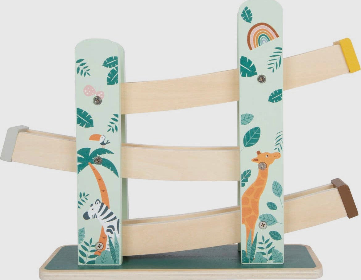 Met vaart door de wildernis! Drie verschillende gekleurde houten wielen versierd met patronen racen over de hellingen op deze houten knikkerbaan in de trendy 'safari look'. De afdaling is rijkelijk versierd met safaridieren en trendy bladmotieven. Baanhoudend speelplezier is onvermijdelijk! Een echte blikvanger en aantrekkingspunt voor elke kinderkamer! Deze knikkerbaan is bijzonder stabiel door zijn brede voet!