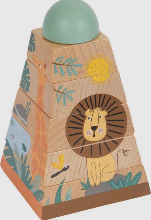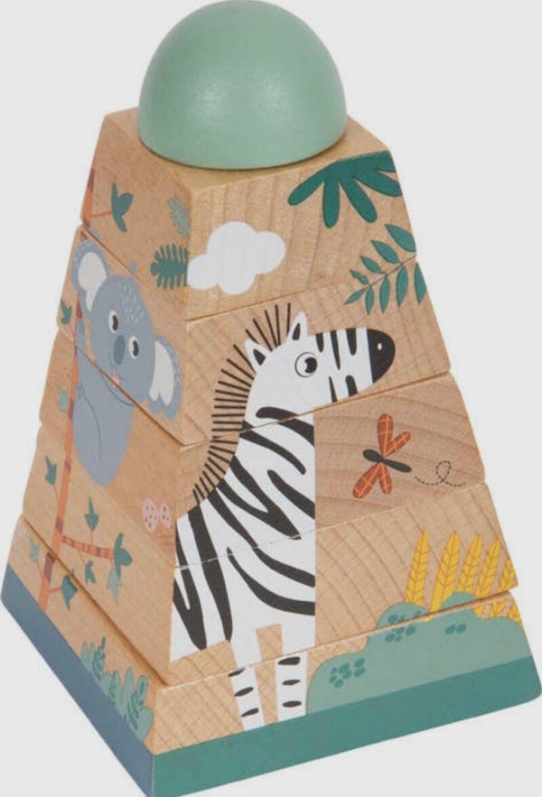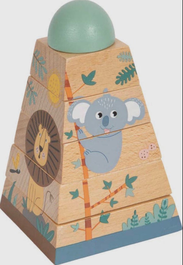 Stapelplezier in een wildernislook! Dit stapelspeelgoed van robuust hout traint behendigheid en ruimtelijke verbeelding. Door de massieve houten blokken in de juiste volgorde bij elkaar te zetten ontstaat er een toren die de vorm van de vriendelijke wilde dieren onthult. Giraffe, koala, zebra en leeuw helpen stapelen! Wanneer de 6-delige stapeltoren in elkaar wordt gezet, worden hand-oogcoördinatie en begrip getraind. Een educaties spel voor de motoriek en behendigheid voor de kleintjes.