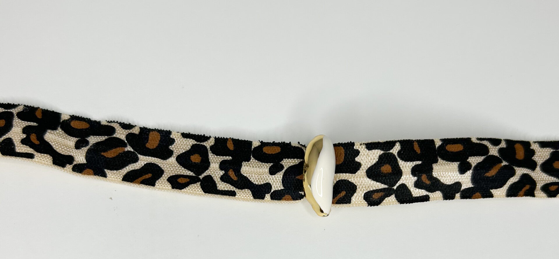 Dit leuke festivalbandje met panterprint is voorzien van een schelpje in goud/wit.