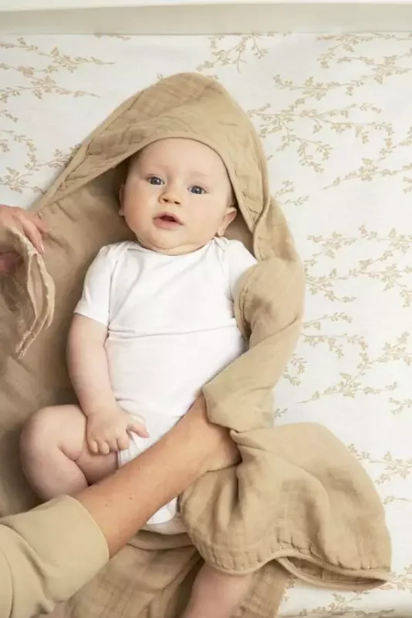 De badcape is gemaakt van 100% hydrofiel katoen, wat ervoor zorgt dat deze vocht goed opneemt en snel droogt. Je kunt de cape gemakkelijk terugvouwen omdat deze extra lang is, zo blijft je kindje lekker warm. De badcape is 80x80 cm.