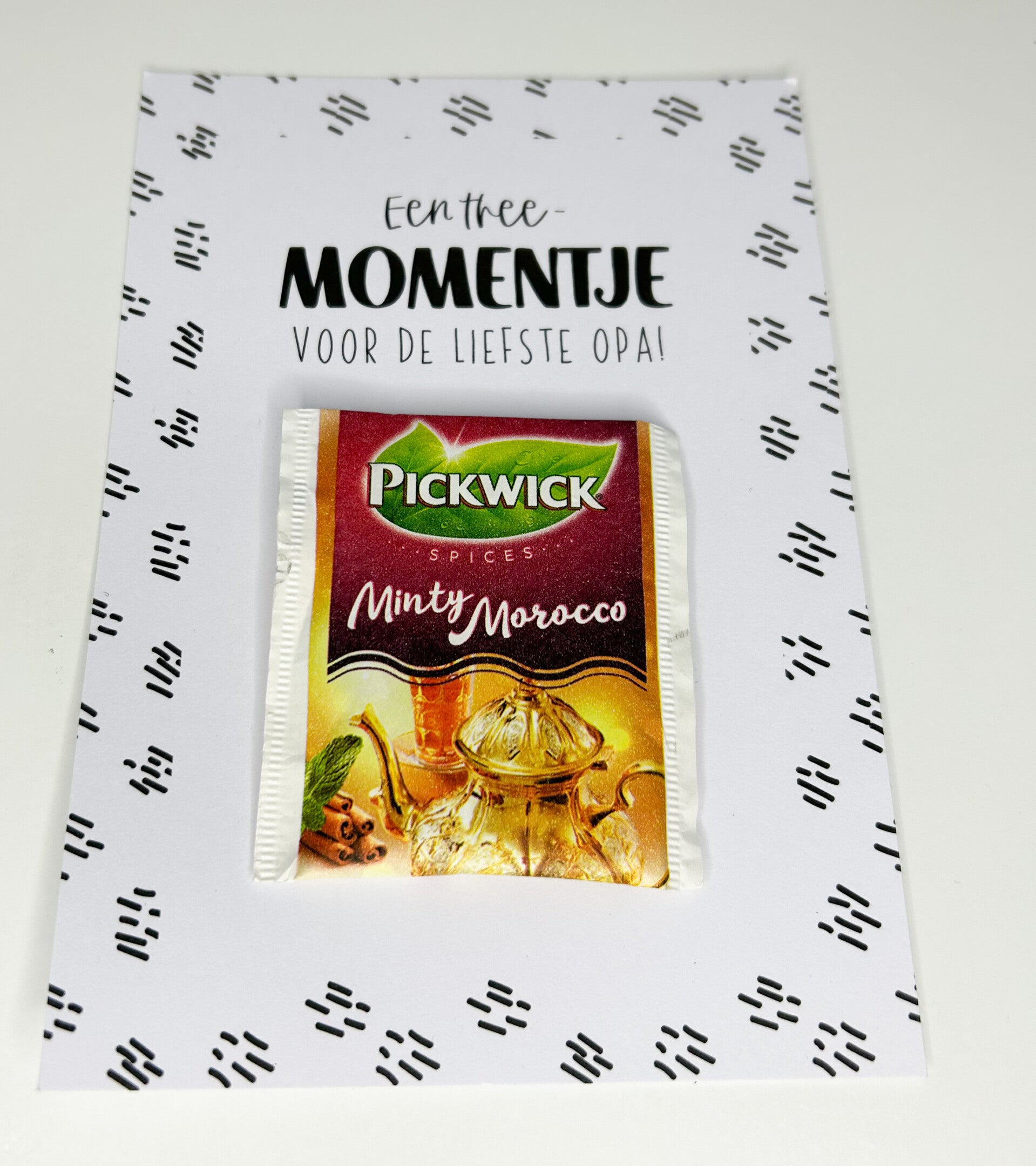 Wenskaart "theemomentje opa". Plak de favoriete thee van opa op deze kaart.