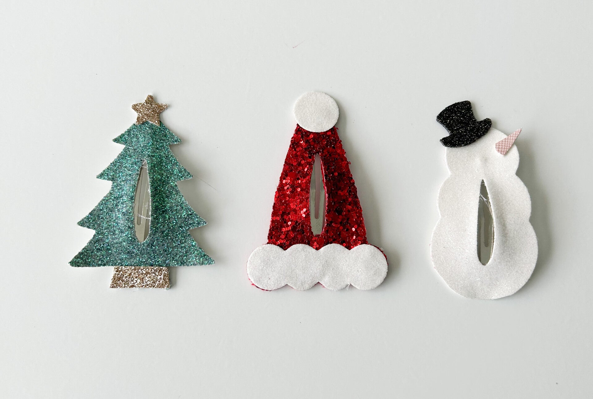 Set van 3 haarspeldjes (klikklak). Deze kerstboom, sneeuwpop en kerstmuts maken de kerst outfit helemaal af! Het zijn grote speldjes!