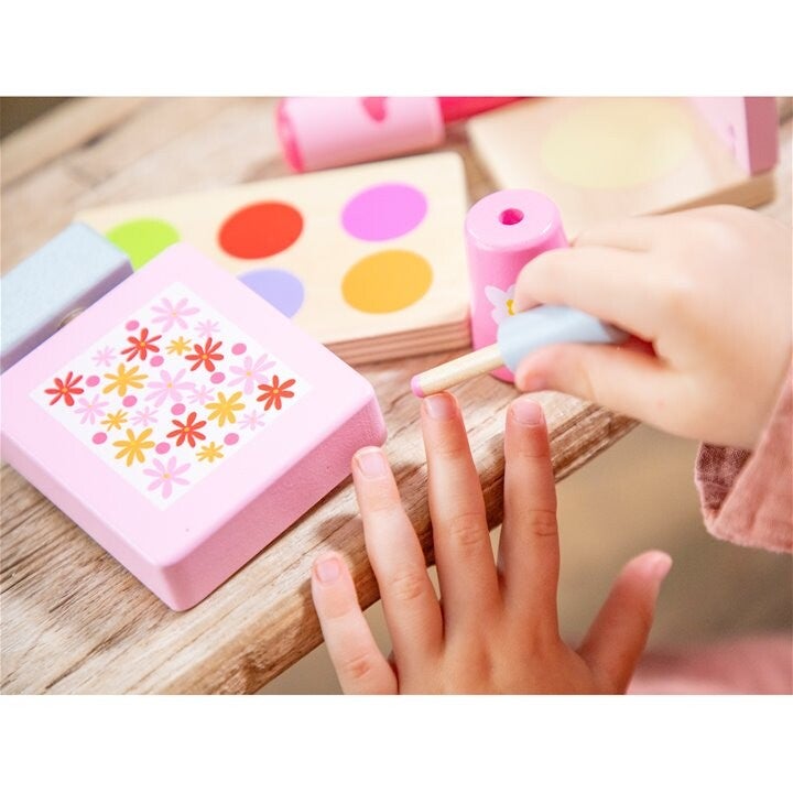 Met dit schattige houten make-up setje kun je al je poppen, knuffels of natuurlijk jezelf opmaken. De zachte make-up tas, 11-delig, is gevuld met: