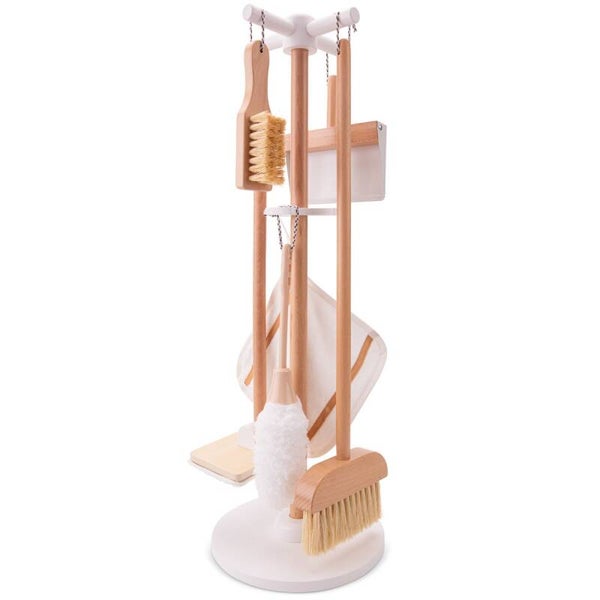 7-delige houten schoonmaakset. Inclusief dweil in kindermaat, een bezem, een plumeau, een schoonmaakdoekje, een stoffer en blik. Alle schoonmaakspullen kunnen opgehangen worden aan de meegeleverde standaard, zodat alles netjes opgeborgen kan worden.