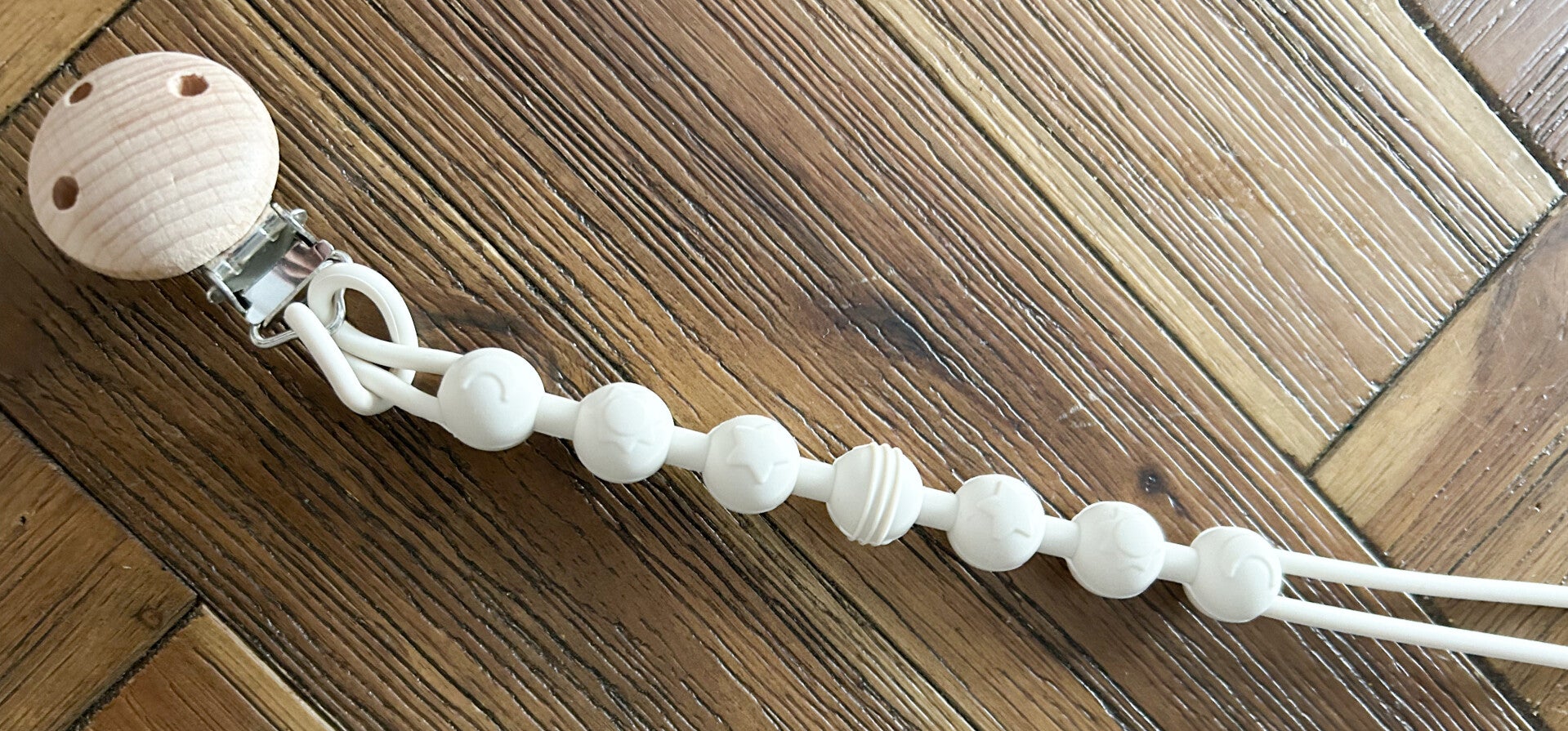 Siliconen speenkoord in crème kleur. Het lijken kralen waar leuke figuurtjes opstaan. Ontzettend fijn als er ook doorkomende tandjes zijn! Ook in lichtblauw en oud roze beschikbaar!