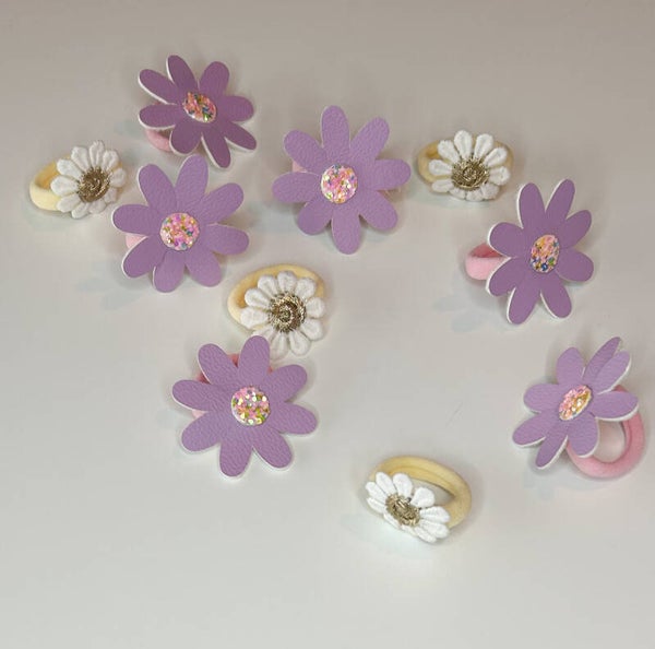 Deze elastiekjes zijn nieuw en nu al favoriet. Op een roze elastiekje een lila bloem met glitterende binnenkant.