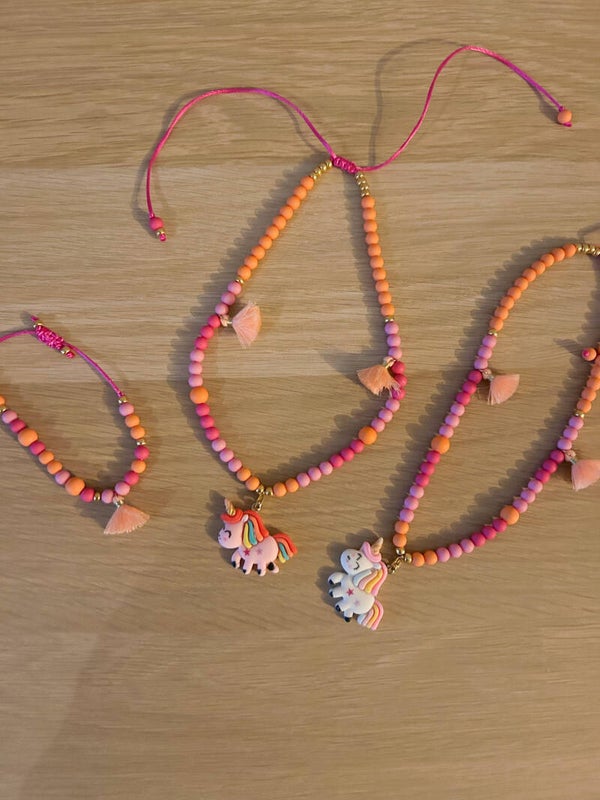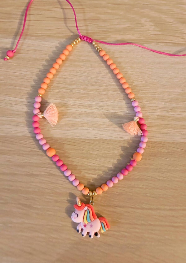 Ketting met verschillende roze en oranje kralen, super leuke kwastjes en een te gekke eenhoornhanger. De ketting is geschikt vanaf 3 jaar en in grote verstelbaar.
