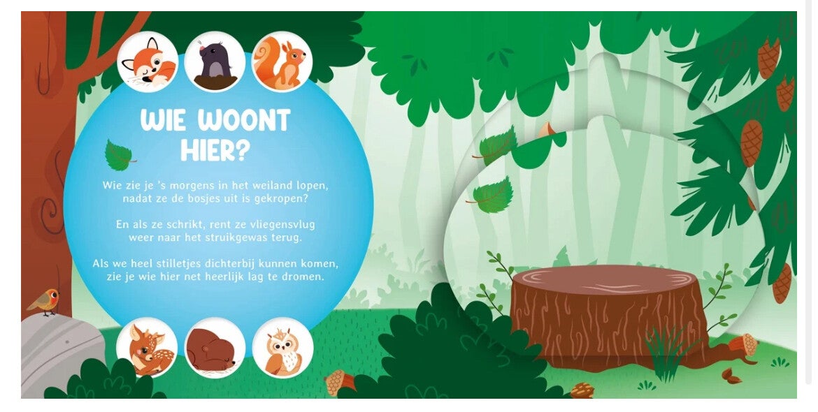 Welke dieren wonen er in het bos? Ontdek het zelf! Maak de flapjes open en kijk waar de uil woont en de beer slaapt. Stevig kartonboek met vrolijke rijmpjes om samen op ontdekkingstocht te gaan.