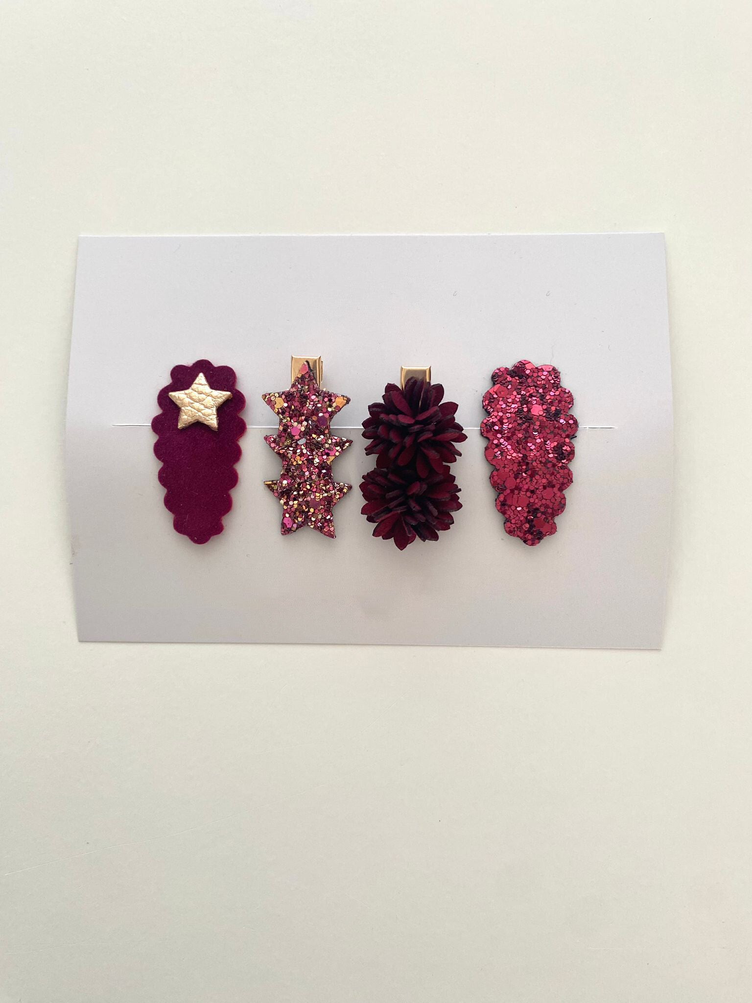 Setje van 4 speldjes in wijnrode kleur. Het setje bestaat uit een velvet speldje met gouden ster- (klikklak), 3 sterren- (alligator), 3d bloemen- (alligator) en glitterspeldje (klikklak).