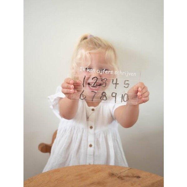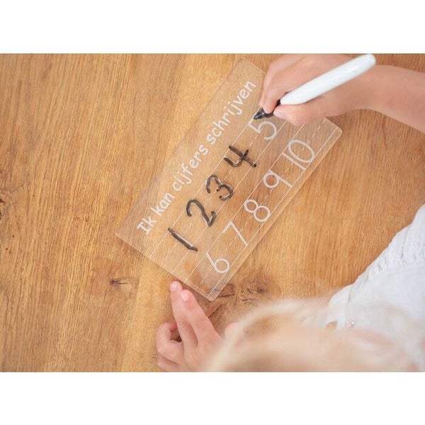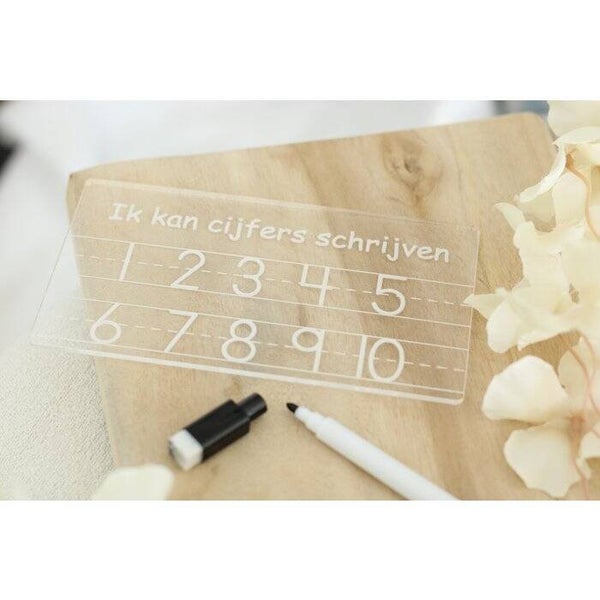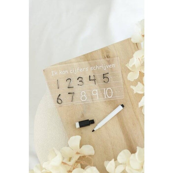 Dit acryl/plexiglas bord is ontworpen voor de kinderen die willen oefenen met cijfers schrijven, de cijfers zijn in het bord gegraveerd. De whiteboard marrker (met sponsje om te gummen) zit erbij.