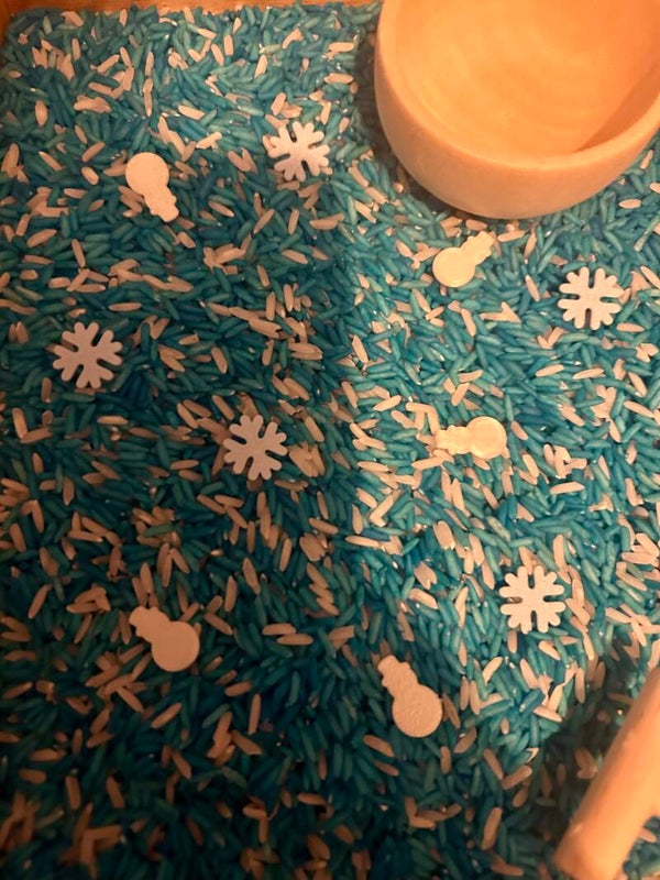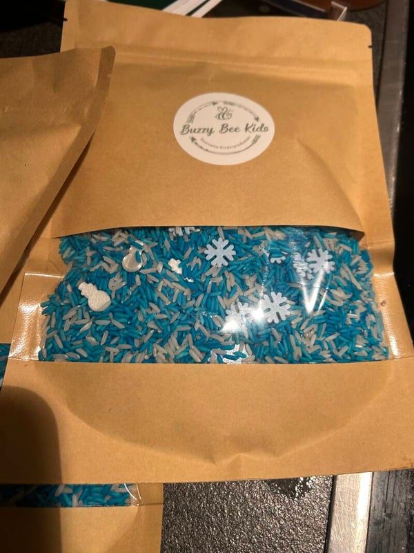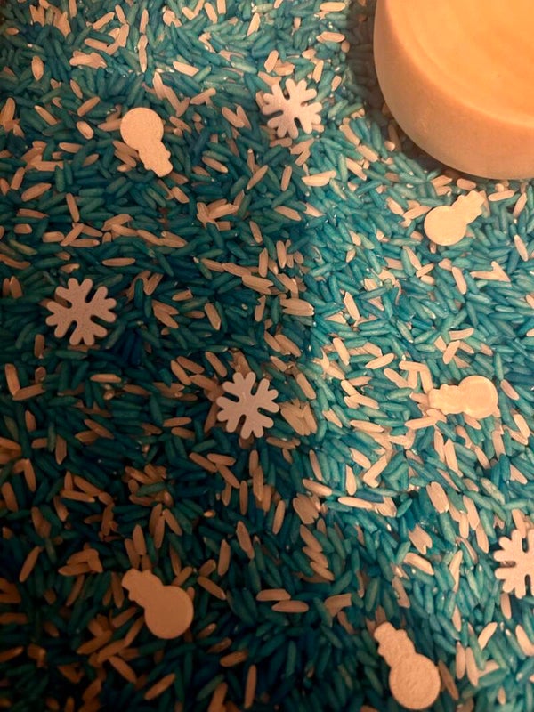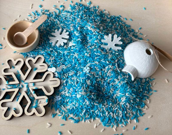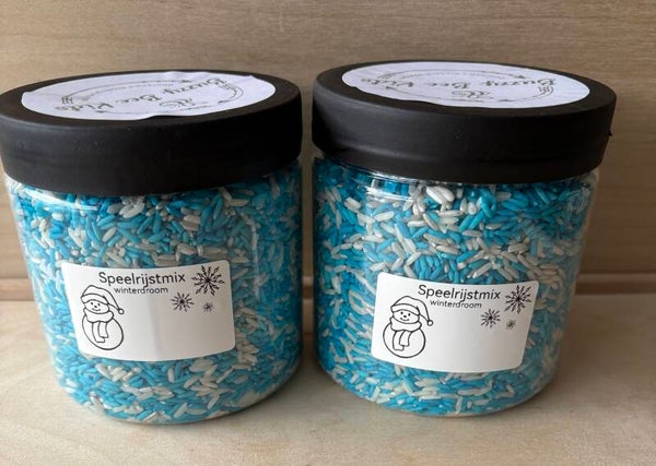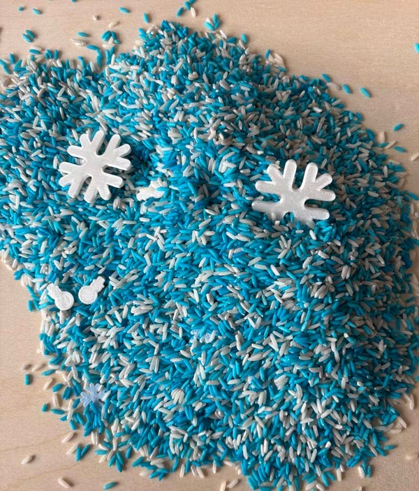 Deze leuke wintermix bestaat uit blauwe en witte rijst met sneeuwpopjes en sneeuwvlokken. Speelrijst zorgt voor urenlang speelplezier en past binnen de trend van sensorisch spelen.
