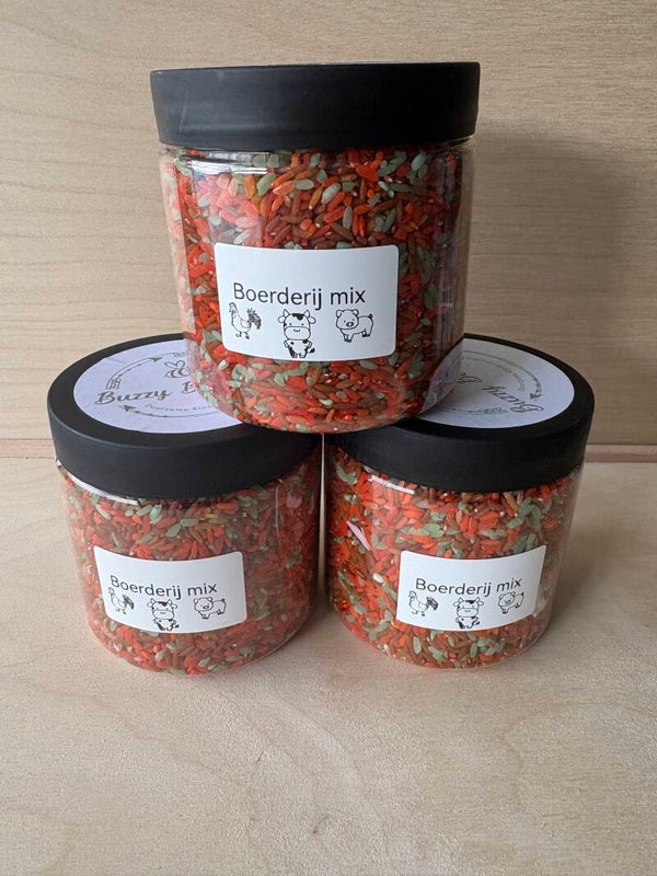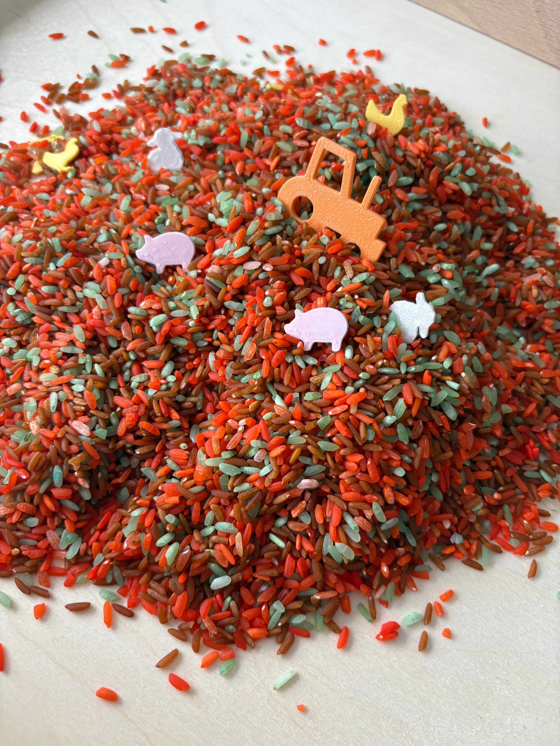 Deze leuke boerderijmix bestaat uit groene, bruine en oranje rijst met schapen, kippen, varkens en een tractor. Speelrijst zorgt voor urenlang speelplezier en past binnen de trend van sensorisch spelen.
