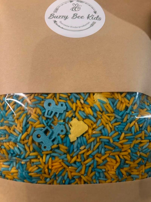 Deze leuke tractor en graafmachine mix bestaat uit blauwe en gele rijst met tractors en graafmachines. Speelrijst zorgt voor urenlang speelplezier en past binnen de trend van sensorisch spelen.