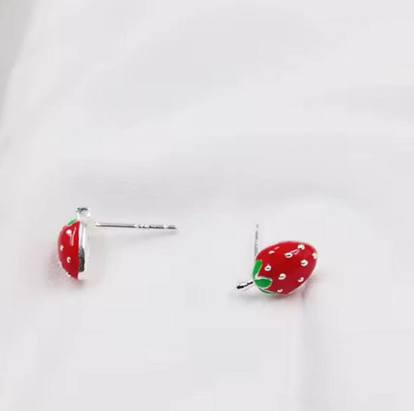 Oorknopjes in de vorm van aardbeitjes met zilverkleurige achterkant.