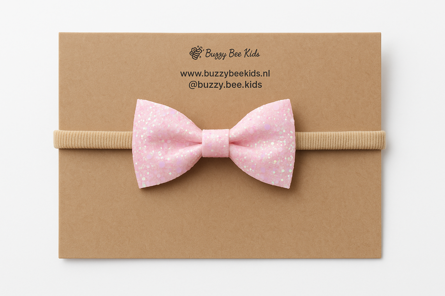Leuk, uniek haarbandje met lichtroze strik en glitters.