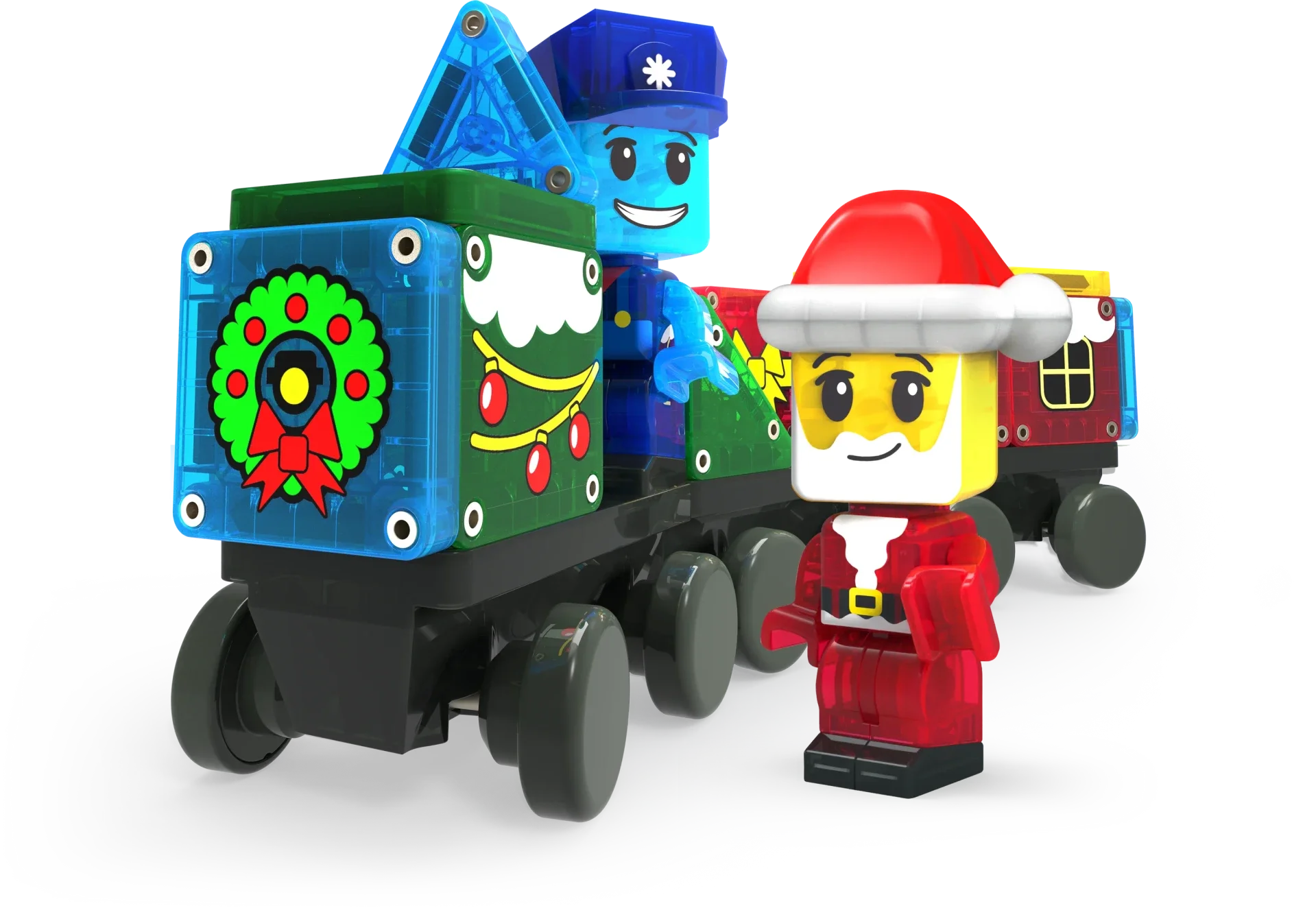 34 nieuwe feestelijke MAGNA-TILES, inclusief een Kerstman- en Conducteur-figuur, en een microChassis.