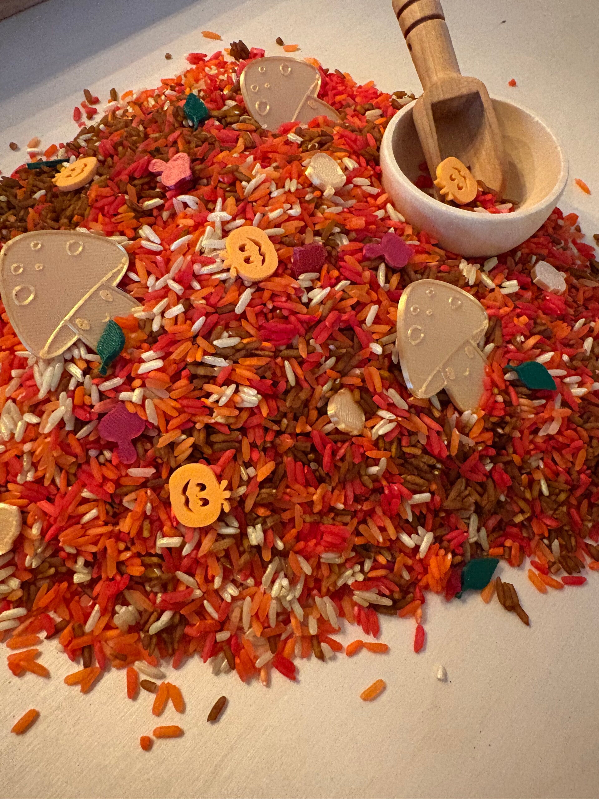 Deze leuke herfst mix bestaat uit rijst in fijne herfstkleurtjes met paddenstoelen, eikeltjes, bladeren en pompoenen. Speelrijst zorgt voor urenlang speelplezier en past binnen de trend van sensorisch spelen.