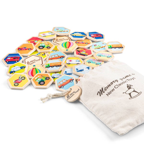 Spelregels: leg de tegels met de afbeelding naar beneden en draai om de beurt twee tegels om. Als je een match maakt, mag je de twee tegels houden, anders draai je ze weer om. De truc is om te proberen te onthouden waar de verschillende voertuigen zijn, zodat je een paar kunt maken. Degene met de meeste tegels (paren) aan het einde van het spel wint. Er zijn 16 paar (32 stuks) met voertuigen geïllustreerde houten tegels om bij elkaar te passen en te verzamelen in dit klassieke spel. Wordt geleverd met een katoenen tas voor eenvoudig opbergen. Dit geheugenspel is gemaakt van FSC® 100% -gecertificeerd hout.