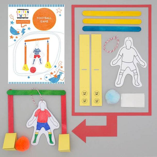 Dit pakket bestaat uit: uitgesneden kartonnen voetballer, doeluitsparingen, lolly sticks, touw, zelfklevende lijmstippen, pom pom.