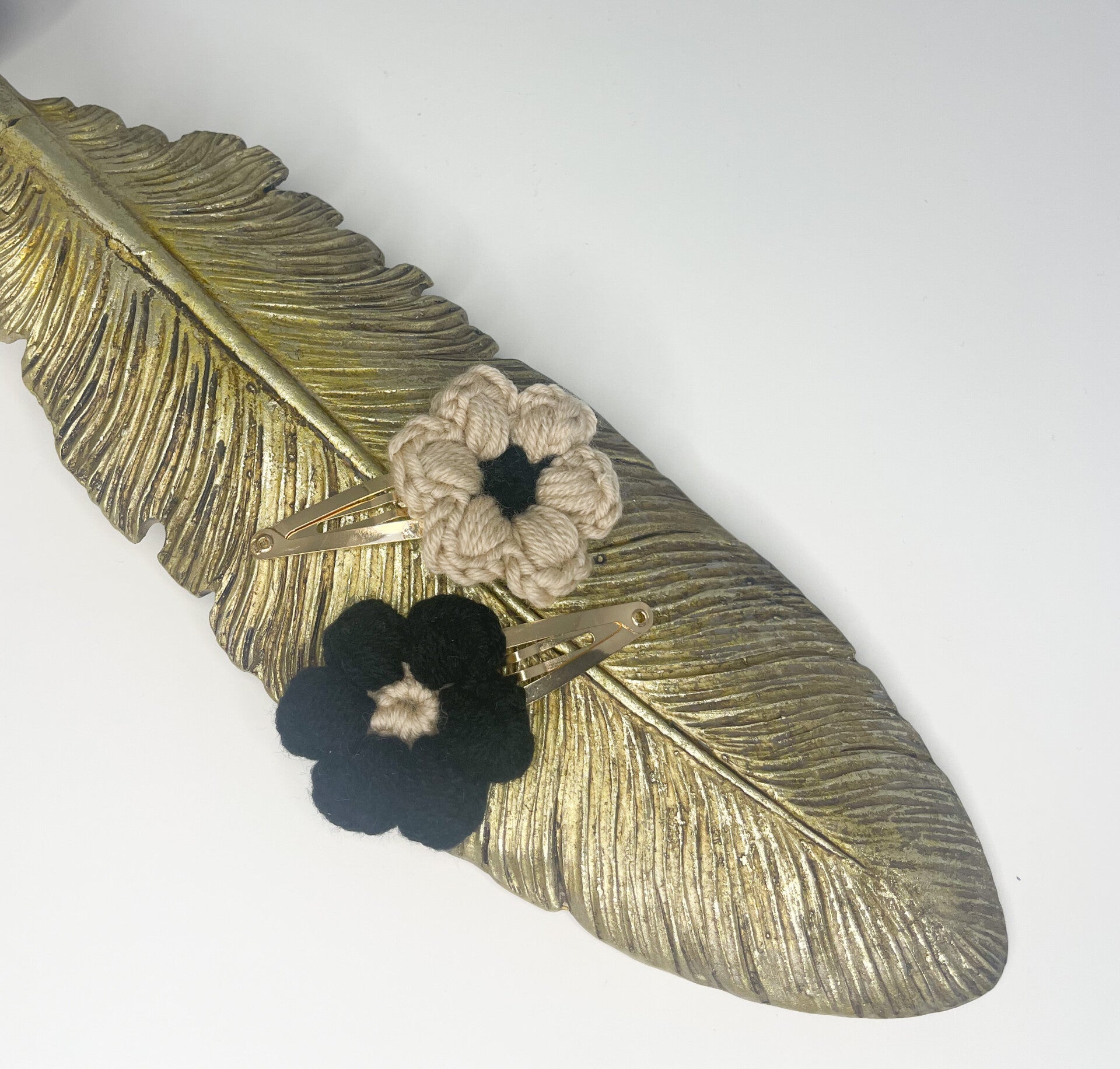 Set van 2 beau speldjes met gehaakte bloem in de kleuren zwart-beige. Beide bevestigd op een goud clipje.