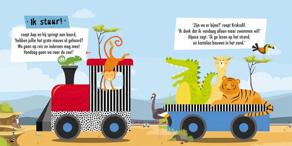 De wilde dieren gaan op reis met de trein. Ga je gezellig mee?