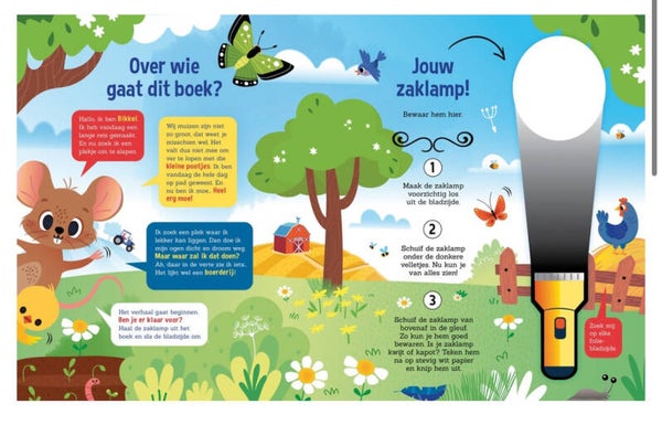 Muisje Bikkel is de hele dag op pad geweest en is moe. Hij heeft zin om een dutje te doen! Hij zoekt op de boerderij een rustig plekje om te slapen, maar dat lukt maar niet. De kippen tokken hem wakker en hij glijdt uit in de modder van de varkens. Help jij hem een handje? Het boek begint met leuke weetjes en feitjes over de boerderij. Hier kom je ook de kartonnen zaklamp tegen. Deze zaklamp heb je nodig voor de pagina's die volgen. In het verhaal staan namelijk gekleurde woorden, die je op de rechterpagina kunt zoeken. Maar dat lukt alleen als je de zaklamp gebruikt! Schuif 'm onder de zwarte pagina en je ziet dat er een lichtbundel ontstaat, waarmee je kunt zien wat Bikkel allemaal beleeft. Bekijk je ook de andere titels in deze serie?